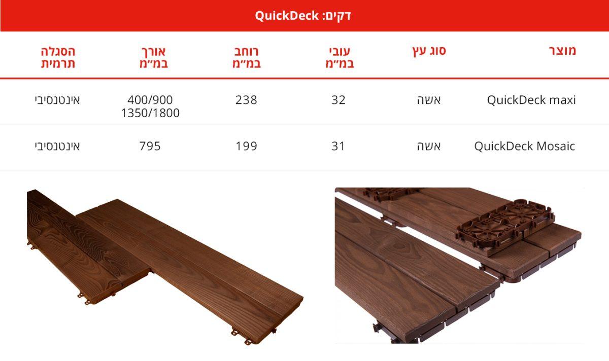 לא חייבת להיות מאתגרת ולדרוש זמן רב. סדרת קוויק דק של THERMORY מציעה מגוון רחב של אריחי דק מוכנים להתקנה מהירה וקלה המתאימה בעיקר להתקנה במרפסות ושטחים מרוצפים. קוויק דק מגיע בשני דגמים שונים: • מקסי • פסיפס שיטת ההתקנה הפשוטה, מתאימה לשטחים מוצקים, שטוחים, פנימיים וחיצוניים.